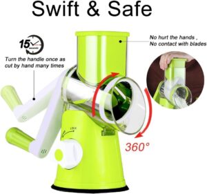 Zero Injury & Easy to Use : No more touching blades, just forget about cutting to get injury.You just need to put a drum blade in the cup groove and insert the food from the feed throat. 360 degree roller cuts food all the time when you shake the handle,shaking 1 circle equals to cut 12 times.