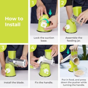 Zero Injury & Easy to Use : No more touching blades, just forget about cutting to get injury.You just need to put a drum blade in the cup groove and insert the food from the feed throat. 360 degree roller cuts food all the time when you shake the handle,shaking 1 circle equals to cut 12 times.