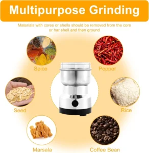 Multi-Purpose Electric Grinder for Coffee & Spices:  This versatile electric coffee grinder is your ultimate kitchen companion. Powered by a robust pure copper motor, it effortlessly grinds coffee beans, spices, herbs, grains, nuts, and seeds in seconds. Transform your kitchen into a hub of fresh flavors, from morning espresso to evening curry masala.